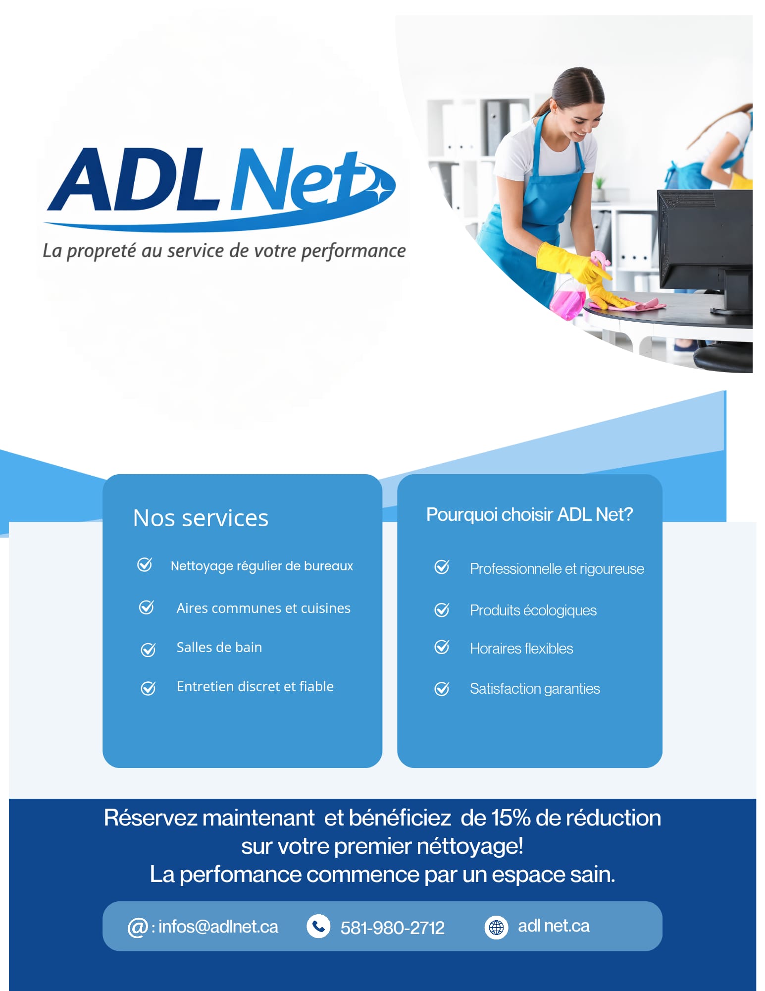 ADL Net est une entreprise spécialisée dans le nettoyage de bureaux professionnels Nous offrons des services d’entretien fiables, rigoureux et adaptés aux besoins des entreprises. Nettoyage régulier, aires communes, salles de bain et planchers. Évaluation gratuite disponible.